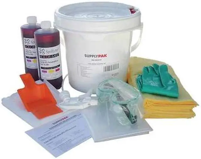 Spill Kit, Neutralizes Chemical Type Acids, Volume Absorbed Per Kit 3 gal, Container Type Bucket, 2 gal Container Capacity, 10 12/25 in L x 9 9/53 in H Container Size, Filled, Sorbents Included Absorbent Harsh Chemical Pads, PPE Included (1) Pair Nitrile Gloves, (1) Pair Goggles, (1) Poly Apron, Additional Components Included 6 Mil Poly Liner, Instructions, Liner Tie, Liquid Locking Polymer, SDS, UN Rated and Dot Approved 2 gal Container with Locking Lid, Product Weight 9 lb. This item has been restricted from sale in the following state (s): []