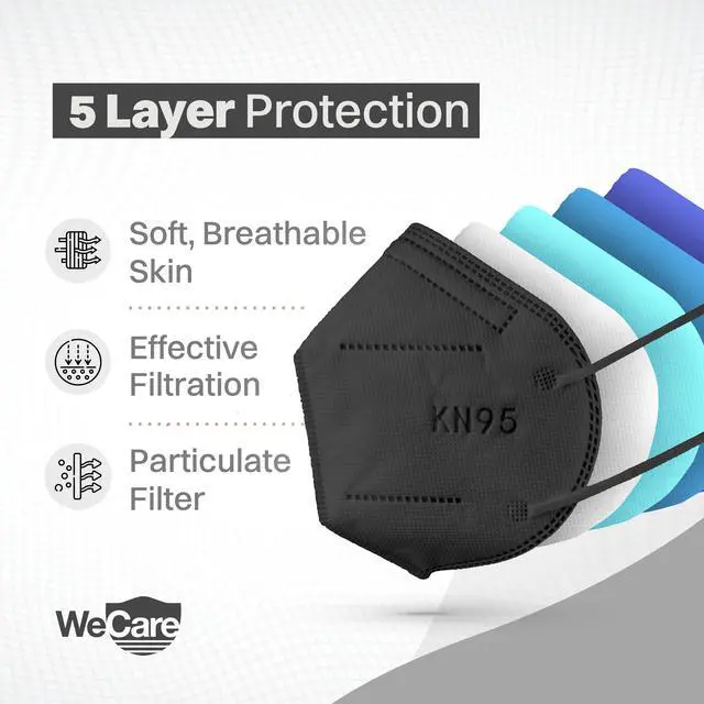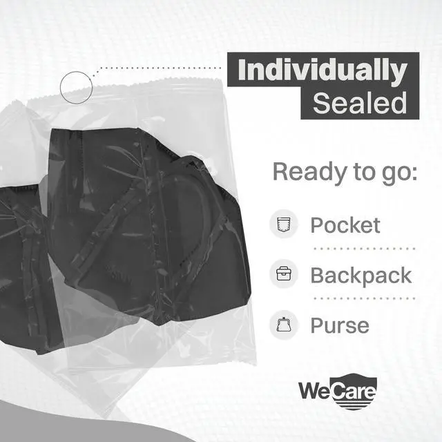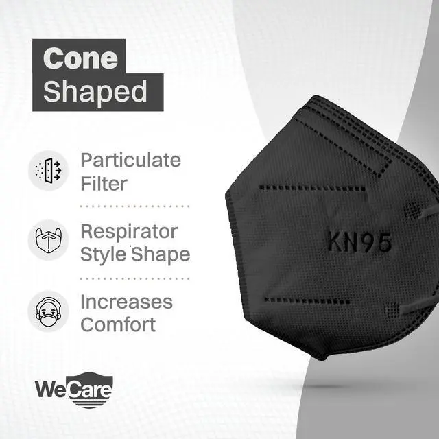 These protective disposable face masks by WeCare are comfortable, breathable, and foldable. The cone-shaped masks offer five-ply protection. The elastic fabric completely fits the face. Inner layer with soft materials contacts your face for comfortable user experience. Suitable for different face shapes. Each mask is individually packaged from the manufacturer for added protection and sanitary use.