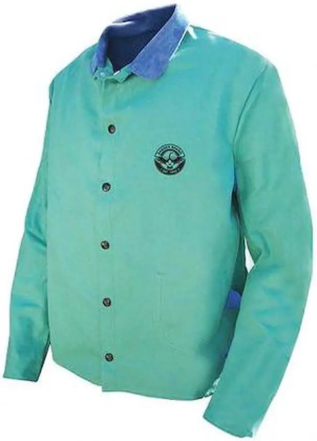 California Proposition 65: This product contains a chemical known to the State of California to cause birth defects or other reproductive harm. Closure Type Snaps, Color Blue/Green, Features Banox (R) Flame Resistant Canvas, Durable, Full Leather Collar, Inside Pocket, Heat Protection Type Flame-Resistance, Welding, Material Cowhide, Size M, Welding Jacket