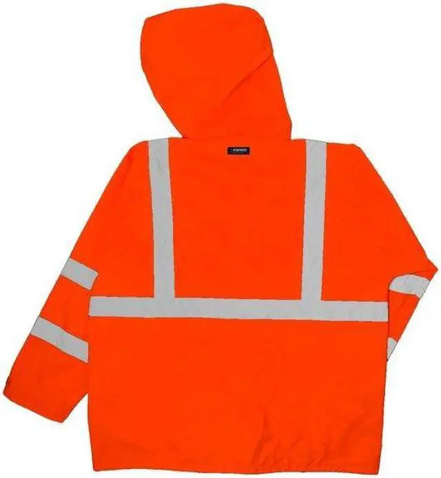Rainsuit, Color Orange, Material Polyester/Polyurethane, Hood Style Packable Hood in Collar, ANSI Class 3, High-Visibility Yes, Size XL, Jacket Length 33 in, Fly Closure Type Zipper, Style 2-Piece Rain Suit with Hooded Jacket and Pants, Includes Lining Yes, Lining Material Polyester, Thickness 6.2 mil, Features Breathable, Will Fit Over Boots Yes, Includes Hood Yes, Hood Features Hidden Collar Hood, Number of Coat Pockets 3, ANSI Type R, Number of Pants Pockets 3. This item has been restricted from sale in the following state (s): []