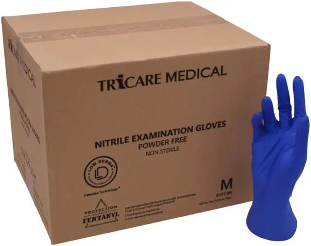 Enhanced Design: Tricare Medical Low Derma Technology Nitrile Exam gloves Known for its exceptional grip and tactile sensitivity. Commonly used for non sterile medical tasks. Can also be used for manufacturing, food service, cleaning, tattoo artists, barber shops and more. If your job requires wearing gloves, you will have to try these gloves. We are sure they will be your new favorite gloves. FDA approved for medical use, latex and powder free. 100 gloves per box or 1000 gloves/case (10 boxes). Sizes from Small to Extra Large.