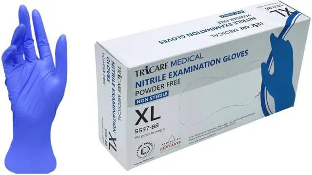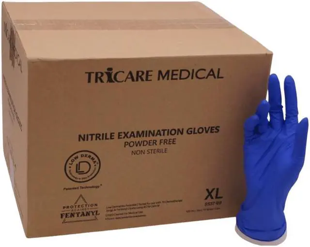 Enhanced Design: Tricare Medical Low Derma Technology Nitrile Exam gloves Known for its exceptional grip and tactile sensitivity. Commonly used for non sterile medical tasks. Can also be used for manufacturing, food service, cleaning, tattoo artists, barber shops and more. If your job requires wearing gloves, you will have to try these gloves. We are sure they will be your new favorite gloves. FDA approved for medical use, latex and powder free. 100 gloves per box or 1000 gloves/case (10 boxes). Sizes from Small to Extra Large.