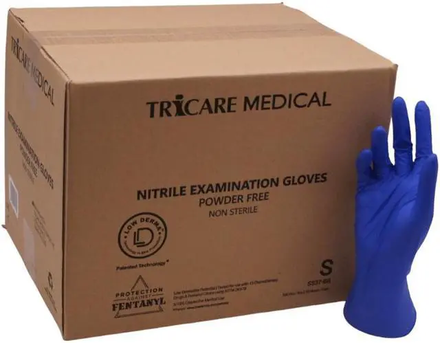 Enhanced Design: Tricare Medical Low Derma Technology Nitrile Exam gloves Known for its exceptional grip and tactile sensitivity. Commonly used for non sterile medical tasks. Can also be used for manufacturing, food service, cleaning, tattoo artists, barber shops and more. If your job requires wearing gloves, you will have to try these gloves. We are sure they will be your new favorite gloves. FDA approved for medical use, latex and powder free. 100 gloves per box or 1000 gloves/case (10 boxes). Sizes from Small to Extra Large.