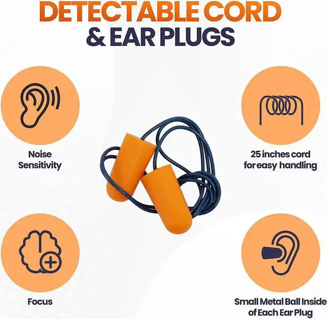 * DETECTABLE CORD AND EAR PLUGS - Metal-detectable earplugs are the ideal methods of hearing protection in food manufacturing facilitiesand they offer more than just hearing protection. Both PVC cord and ear plugs are detectable.