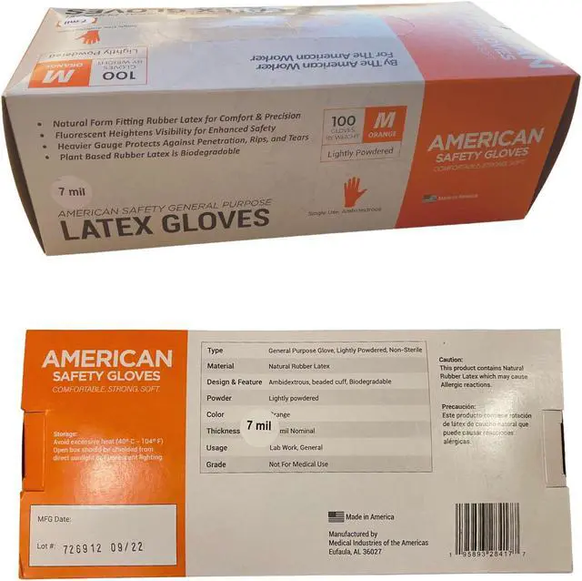 The American Safety Non-Sterile Latex Safety Gloves are Made in America by the American worker for The American Worker. Our 7 MIL Disposable, Latex, General Purpose Safety Gloves are produced with a uniquely processed non-allergic, low protein, premium natural rubber latex and coated with calcium carbonate, facilitating grip and high performance in wet and dry environments while being gentle on the skin. Our ambidextrous Safety Gloves provide reliable protection against non-hazardous materials. The calcium carbonate powdered coating absorbs moisture and humidity yet gentle on the skin while simultaneously increasing durability. The durability heightens protection against tearing or ripping, and puncture without compromising on elasticity and functionality.