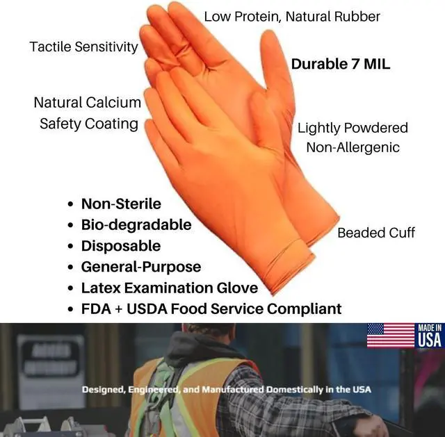 The gloves are ambidextrousdesigned to function on both the right and left handand cut for a close-to-the-skin fit. This glove is thicker, softer, and more durable when compared to medical or other thinner disposable latex, nitrile, or vinyl gloves. The premium natural latex rubber is superior, mimicking the sensory feeling of the skin and molding to the hand like a second skin, providing a full tactile sensory transfer. The bio-degradable Safety Gloves are widely used for non-sterile medical exam, laboratory, industrial, commercial, MRO, hospitality, food service, janitorial, arts and crafts, tattooing, salon, pet care, agriculture, auto care, and assembly work for all-day comfort and dexterity, They are compliant with Food Service CFR 177.2600, made in our ISO/ASTM + FDA QSR facility.