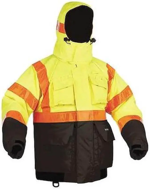Flotation Jacket, USCG Performance Level Level 70, Product Type Flotation Jacket, Buoyant Material Foam, Color Yellow, Buoyancy 15 1/2 lb, Inflation Mechanism Not Applicable, USCG Type Type III, Reflective Reflective, Size M, Closure Belt, Zipper, Features Removable Hood, D-Ring Attachment, Mesh Drainage, Orange Reflective Tape, Neoprene Inner Cuff, Outer Material Nylon, Standards USCG Approved, Buoyancy Principle Inherently Buoyant