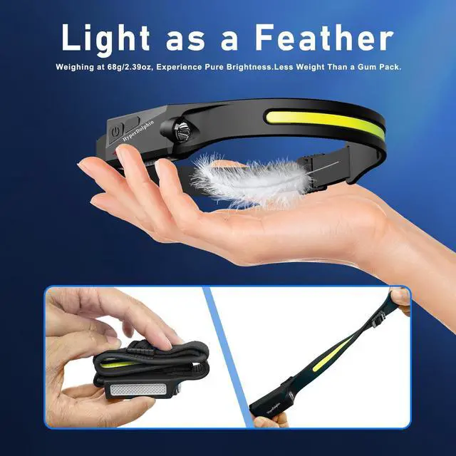 With a 230° wide beam, it provides broad illumination for camping, cycling, fishing, and other outdoor activities. Weighing only 68 g (2.4 oz) per unit, it’s lightweight and comfortable for long wear; the adjustable headband ensures a secure fit for adults and kids.