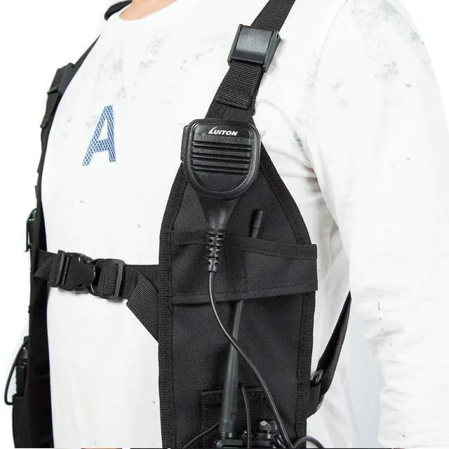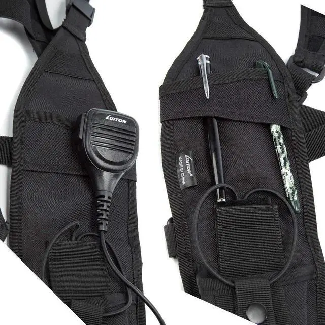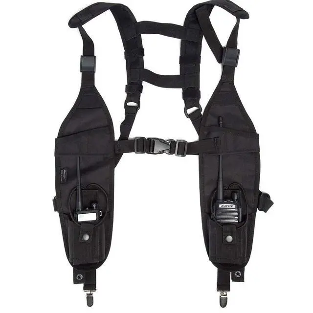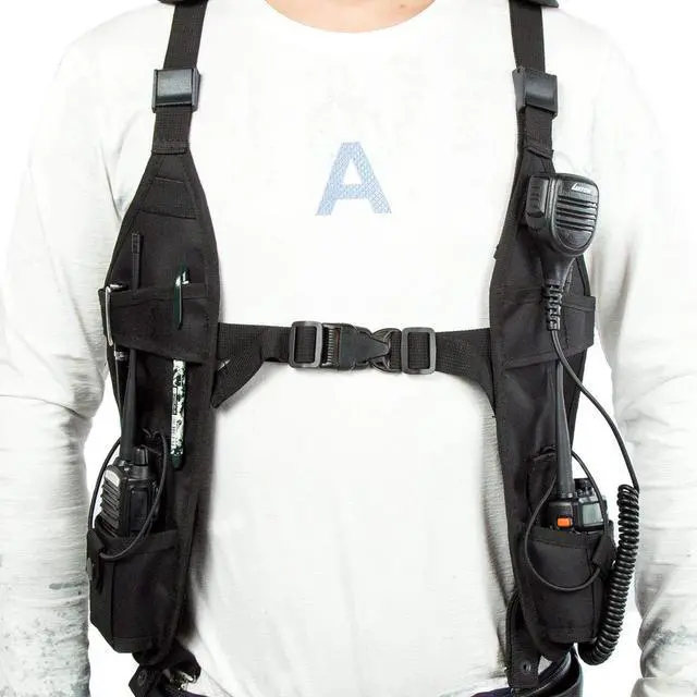 It is a dual two way radio holster designed to hang under both arms with the comfort adjustable straps. a low profile radio harness providing 2 simply designed; easy to maneuver radio pouches. And with one American Flag Patch