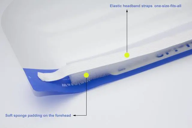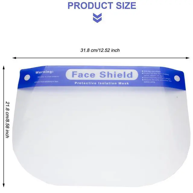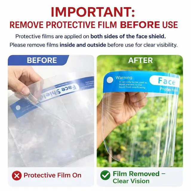Equipped with double-sided protective films that must be removed before use to ensure clear visibility. The high-transparency PET material helps maintain clear vision during extended wear, suitable for tasks like dental work, cooking, or general workplace use.