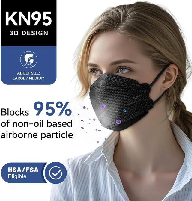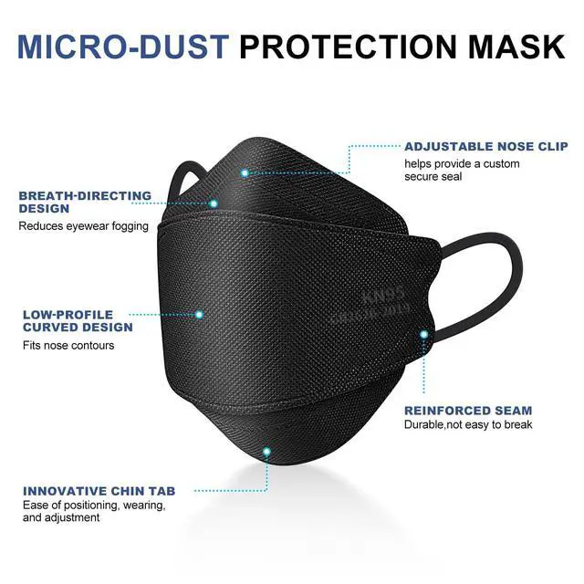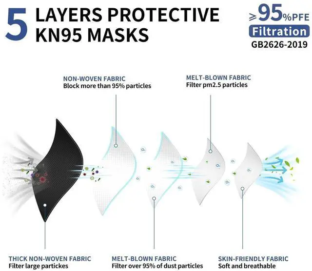 Our KN95 face masks feature a 5-layer filtration system that efficiently blocks over 95% of harmful particles, including dust, allergens, and pollutants, ensuring superior protection and comfort for adults