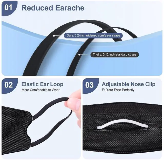 Our KN95 disposable masks for adults feature a 0.2-inch wide ear strap, providing a secure, comfortable fit and effectively reducing ear discomfort. Ideal for face masks in bulk, these loops face masks offer lasting comfort for extended wear