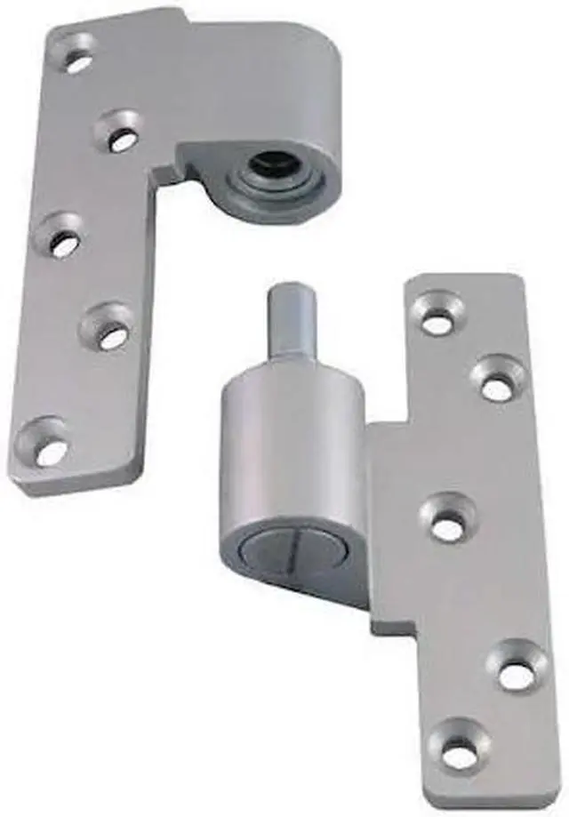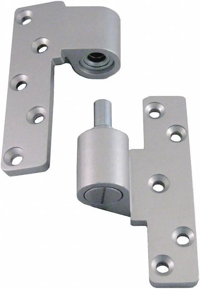 Pivot Hinge, Cast Aluminum Material, Aluminum Finish, 125 lb Load Capacity, With Holes, 5 Holes per Leaf, No Ligature Resistant, 180 Degrees Range of Motion, Orientation Right Hand, 0.375 in Door Leaf Thickness, 0.25 in Frame Leaf Thickness, Ball Bearing Type, Included Hardware, Surface Mounting, 0 Number of Wires, Door Leaf Height 5 in, Door Leaf Width 2 1/16 in, Frame Leaf Height 5 in. This item has been restricted from sale in the following state (s): []