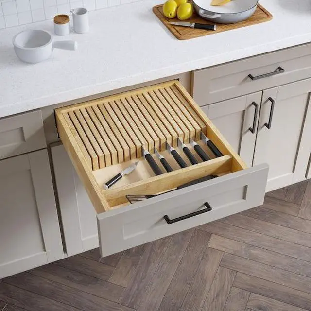Declutter your drawer and store knives securely with a knife block drawer insert. No installation required; just simply drop in the drawer. For use in 18" wide drawers and can be trimmed to fit. 19 slots and built-in front divider to make two compartments.