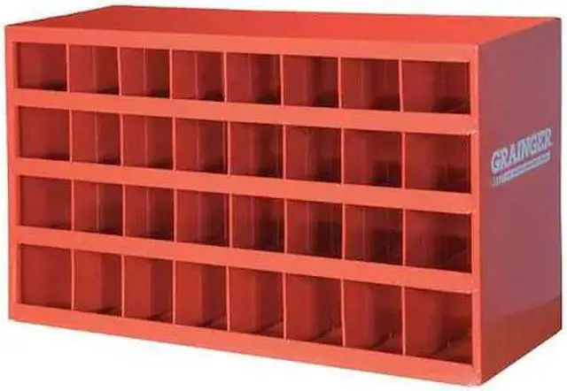 Pigeonhole Bin Unit, Compartment Depth 11 7/8 in, Compartment Height 4 1/2 in, Compartment Width 4 in, Steel, Overall Depth 12 in, Overall Height 18 in, Overall Width 34 in, Number of Compartments 32, Red, Powder Coated. This item has been restricted from sale in the following state (s): []