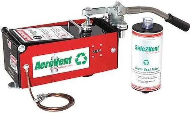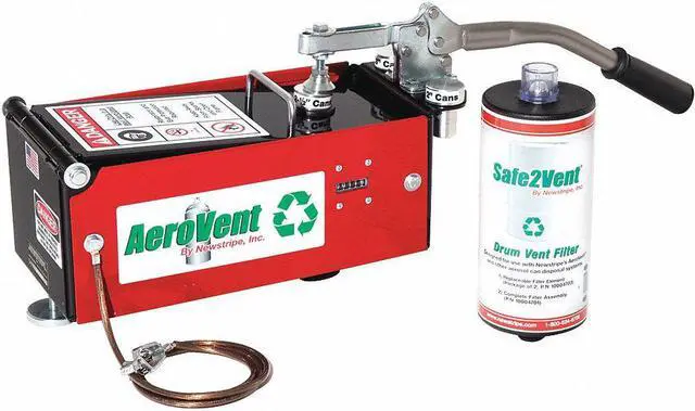 Safely dispose of aerosol cans with the NEWSTRIPE AeroVent aerosol can disposal system with counter. Fast and economical, just one stroke punctures and drains 2"- to 3"-dia. cans up to 10-1/2"H in a completely sealed chamber. The chamber includes the Safe2Vent™ coalescing carbon filter with the Viz-a-Ball™ check ball indicator to show operator when can is depressurized. Easily installs on any standard 30- or 50-gal. drum without tools. Disposal system includes spark-resistant components, cycle counter, and grounding cable. Compliant in all 50 states and conforms to EPA, OSHA, and California regulations for “closed drums.” One Can Aerosol Can Disposal System
