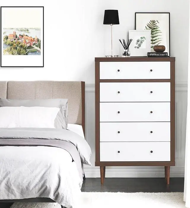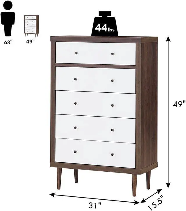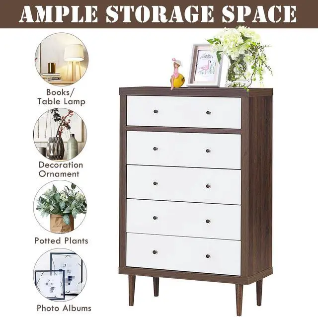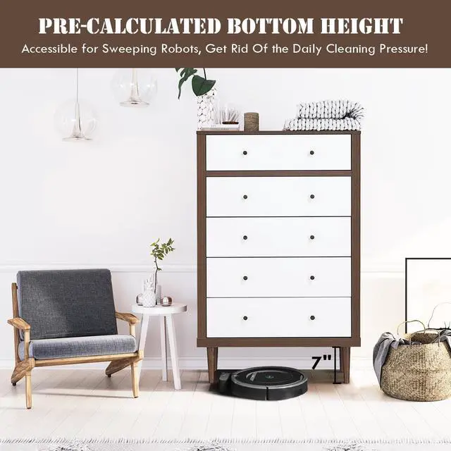 Large storage space with 5 tier structure almost can hold all your daily supplies and can classify your items for convenient fetch-up. And the lifted height feet is easy for robot sweep to access and anti-slip bracket ensures a long-time standing. P2 standard particle board with MDF paper provides a smooth surface for clean the dust. Combining the aesthetic appearance with modern simplicity, this wood chest of drawers is perfect for your bedroom, bathroom, study room or hallway.