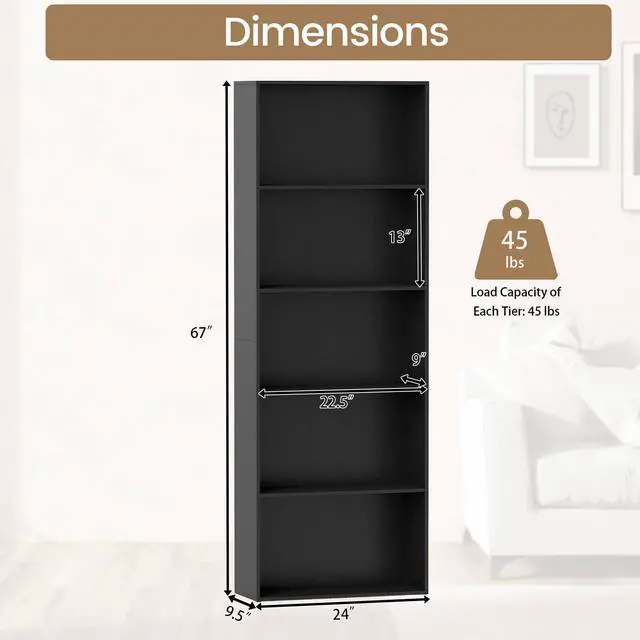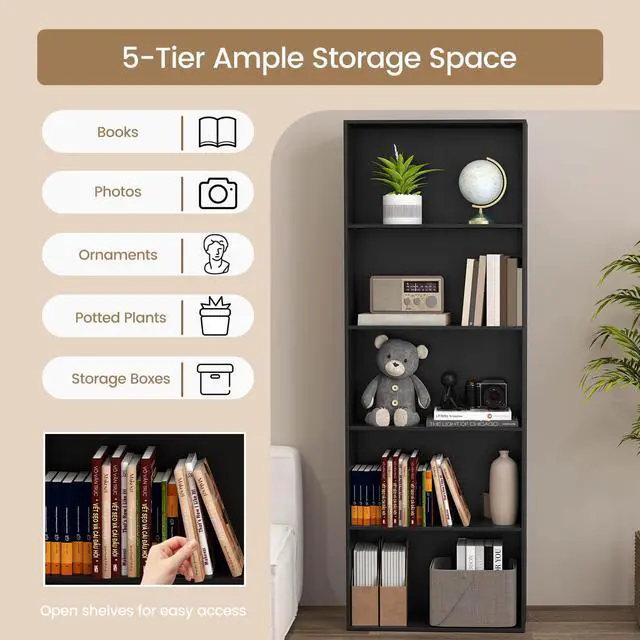 Introducing our versatile 5-tier bookcase, the perfect storage solution for your home! This robust and safe construction ensures stability, with 2 anti-toppling devices included for added safety. Organize books, photos, ornaments, potted plants, storage boxes and knickknacks effortlessly, maximizing vertical space without overcrowding. The minimalist design blends seamlessly with any furniture style, making it a striking addition to your living room, study, or bedroom. Elevate your space with this efficient and stylish storage solution today!