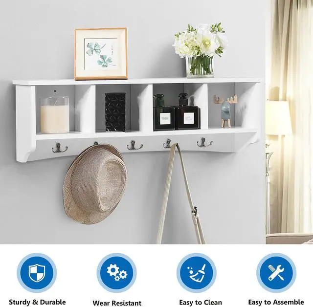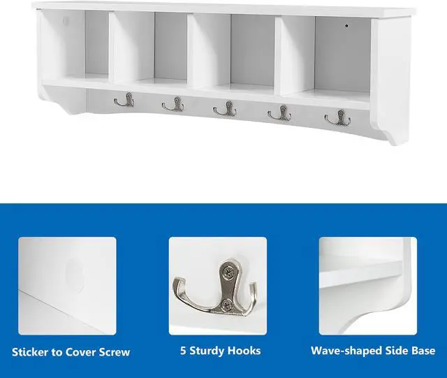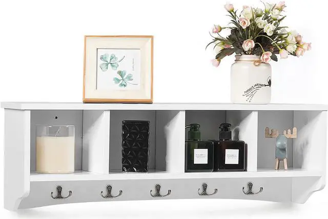 Are you finding a wall-mounted cabinet to enlarge your storage space? Our practical storage cabinet is a good choice for you. There are also four compartments for storing your sundries and five hooks to hang your coat, key and umbrella. Made of hard density board, the structure of cabinet is sturdy for sturdy use. Designed in modern and concise style, the storage cabinet is perfect to suit for any kind of decoration of living room, kitchen, bedroom or bathroom. What's more, this set not only provides functional storage but also doesn't take up your valuable floor space. After receiving the parcel, the cabinet is easy to assemble according to the instructions and all required accessories by yourself.