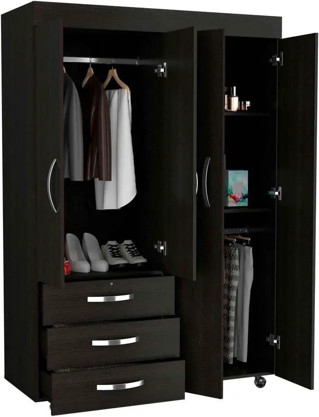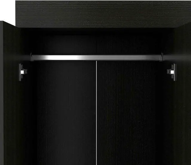 Janeiro Armoire, this extensive wardrobe comes to the rescue! Features with all the functionality you need for your home. On the left side, a double-door cabinet with an interior hanging rod will give you great space to hang your clothing, three drawers for you to put even more items away, at the bottom of the cabinet, a second space with a hanging rod expands your options. And another tall double-door cabinet conceals two shelves (13.4" High and 17" High) All metal hardware for smooth running and quality of your drawers and beautiful, modern door pulls are a great touch to this product.