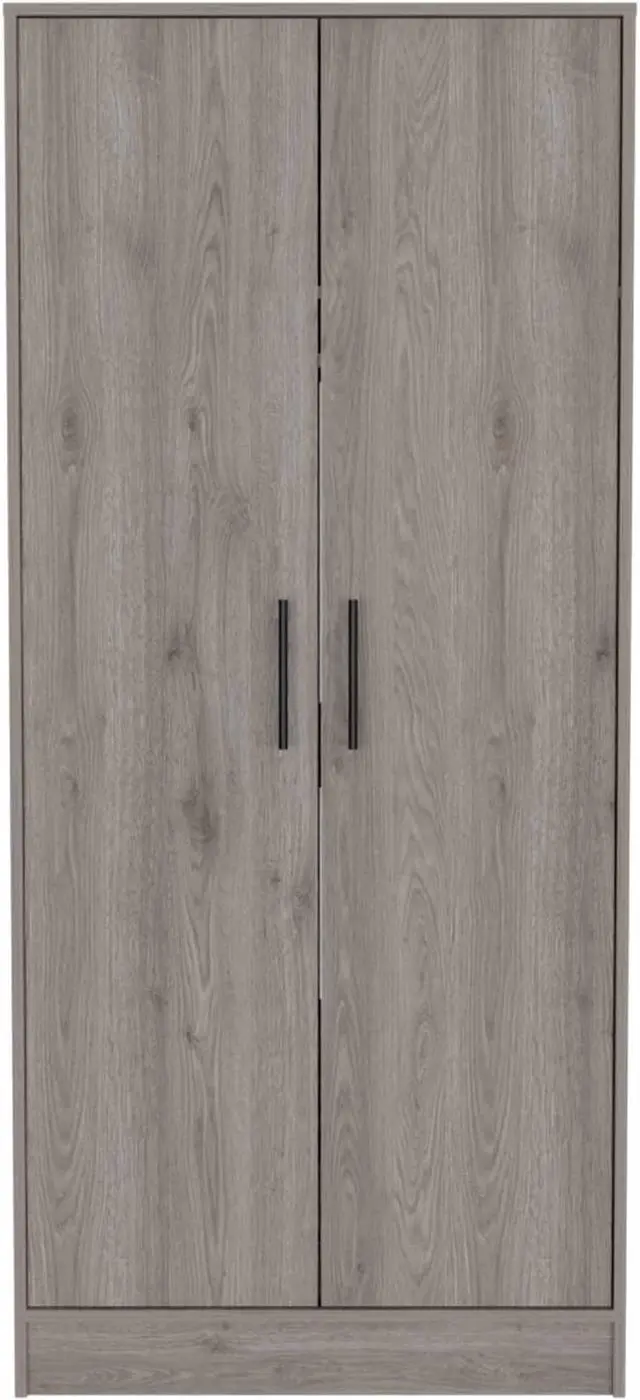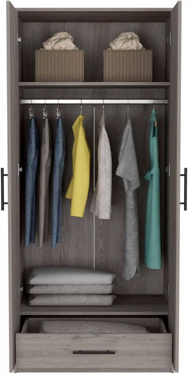 San Blas Double Doors Armoire, cant decide what youre planning to store in your bedroom? The San Blas 2 Door Armoire, is versatile enough to accommodate just about anything you choose! Insert the adjustable shelf or as well. Featuring two doors concealing all your items, use a hanging rod to store clothes; inside, you will find plenty of room on a top shelf to keep blankets, sheets, and pillows nearby (13,4" H x 31.4" W). Mix that with a bottom shelf for the perfect space to squeeze in more storage. Last, a huge drawer (4.9" H ) is the final touch to get all the storage space you may need. Designed with elegant light gray manufactured wood finish.