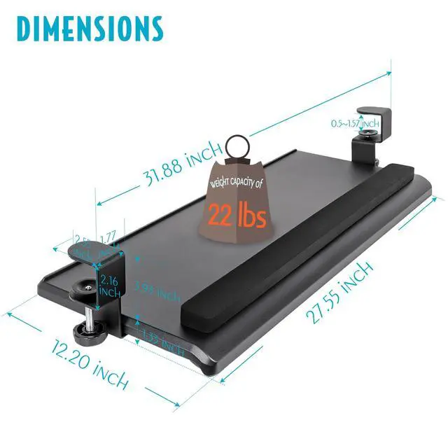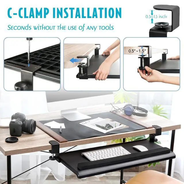 Large Ergonomic C-Clamp Keyboard Tray Mount Under Desk with Wrist Rest, Slide-Out Platform 27.5" (31.8" Including Clamps) x 12.5", Pull Out Keyboard & Mouse Tray for Home or Office, Black