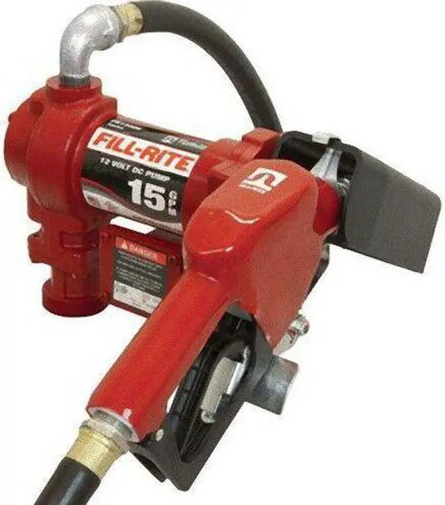 The FR1210HA model is a 12V DC, 15 GPM, heavy-duty fuel transfer pump. This pump and accessory bundle comes complete with a hose, nozzle, suction pipe, and installation components.