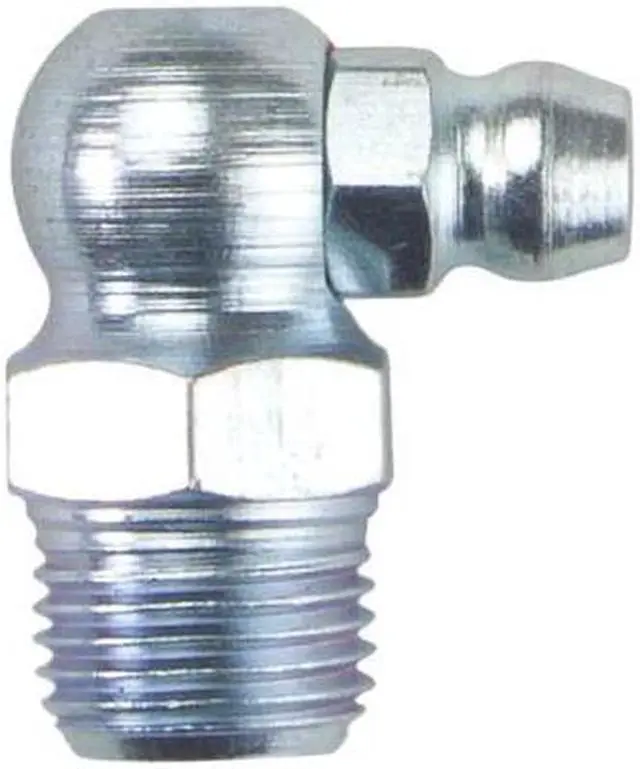Grease Fitting, Grease Fitting Style Standard, Fitting Material Steel, Fitting Finish Zinc-Plated, Fitting Head Angle 90.0 Degrees, Fitting Thread Size 1/8 In. -27, Fitting Thread Type PTF, Overall Length 27/32 in, Max. Pressure 6, 000 psi, Meets/Exceeds SAE J-534-C, Package Quantity 10. This item has been restricted from sale in the following state (s): []