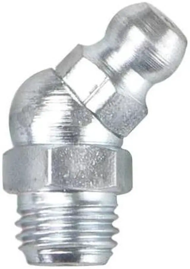 California Proposition 65: This product contains a chemical known to the State of California to cause birth defects or other reproductive harm. Grease Fitting, Grease Fitting Style Standard, Fitting Material Steel, Fitting Finish Zinc-Plated, Fitting Head Angle 45 Degrees, Fitting Thread Size M8- 1.00 mm, Fitting Thread Type Metric, Overall Length 7/8 in, Max. Pressure 5, 000 psi, Meets/Exceeds DIN 71412, Package Quantity 10