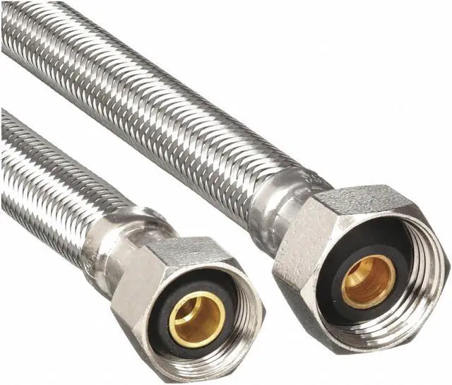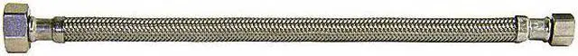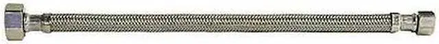 Faucet Connector, Hose Inside Dia. 5/16 in, Hose Length 20 in, Hose Tube Material PVC, Hose Cover Material Stainless Steel, Max. Working Pressure @ 70 F 250 psi, Temp. Range 40 Degrees to 180 Degrees F, Standards IAPMO, NSF, Hose Fitting A Material Brass, Hose Fitting B Material Brass, Hose Fitting A Type F Compression, Hose Fitting B Type FIP, Hose Fitting A Size 3/8 in, Hose Fitting B Size 1/2 in, Hose Configuration Bulk Hose, For Use With Faucet, Application Lavatory and Kitchen Faucets.