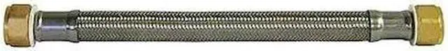 Water Heater Connector, Hose Inside Dia. 5/16 in, Hose Length 18 in, Hose Tube Material PVC, Hose Cover Material Stainless Steel, Max. Working Pressure @ 70 F 250 psi, Temp. Range 40 Degrees to 180 Degrees F, Standards IAPMO, NSF, Hose Fitting A Material Brass, Hose Fitting B Material Brass, Hose Fitting A Type F Compression, Hose Fitting B Type FIP, Hose Fitting A Size 3/4 in, Hose Fitting B Size 3/4 in, Hose Configuration Bulk Hose, For Use With Water Heater, Application Water Heater.