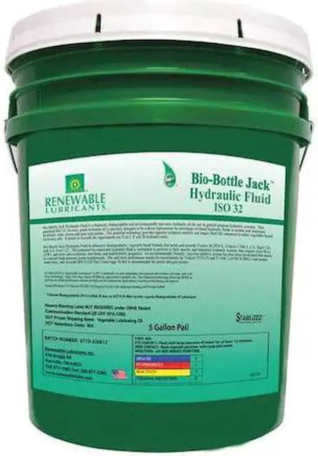 Hydraulic Oil, ISO Viscosity Grade 32, SAE Grade Not Specified, Base Oil Vegetable Oil, Container Size 5 gal, NSF Rating Not Rated, Min. Operating Temp. -20 Degrees F, Max. Operating Temp. 250 Degrees F, Viscosity Index 186, Flash Point 550 Degrees F, Pour Point -31 Degrees F, Container Style Pail, Color Light Yellow, Timken OK Load Not Specified. This item has been restricted from sale in the following state (s): []