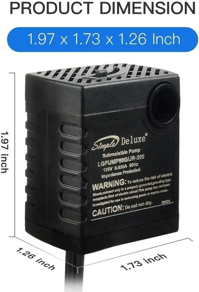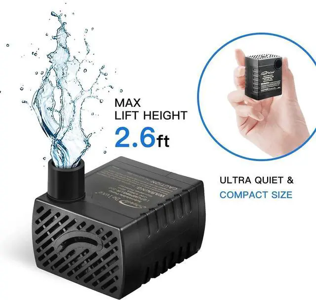 Pre-filter included: pre-filter on the intake prevents debris from entering your pump and extend the life of your pump. The max flow rate is 80GPH, max lift height is 2.6 ft.