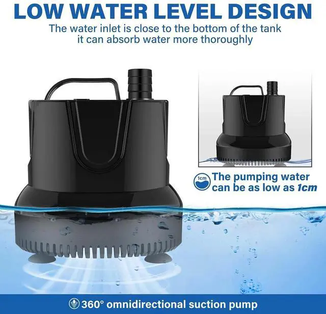 Designed for use with low water levels: this pumps water inlet is close to the bottom of the tank, and can pump water from as low as 1cm; The 360 omnidirectional filtering, solving the problem of cleaning your fish tank.