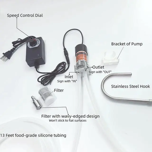 What's in the Box? Everything You Need to Start Pumping Right Away! 1 × Electric Water Transfer Pump (with Mounting Bracket) 1 × 110V Power Adapter (US Plug, work from 100 to 240V AC) 1 × 4m(13ft) Food-Grade Silicone Tube 2 × Stainless Steel Inlet Filters 1 × Stainless Steel Hook Tube (for easy insertion into jugs and bottles)