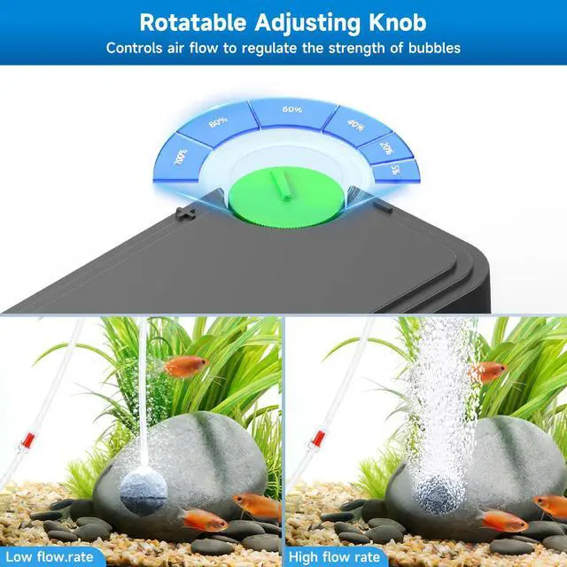 Efficient Dual Outlet with Adjustable Flow This energy-efficient 5W pump comes with two outlet ports to connect multiple airstones or devices simultaneously. The integrated flow control knob allows you to easily customize bubble size and intensity, providing the ideal oxygen level for small to medium tanks (50-300 gallons) or hydroponic systems.