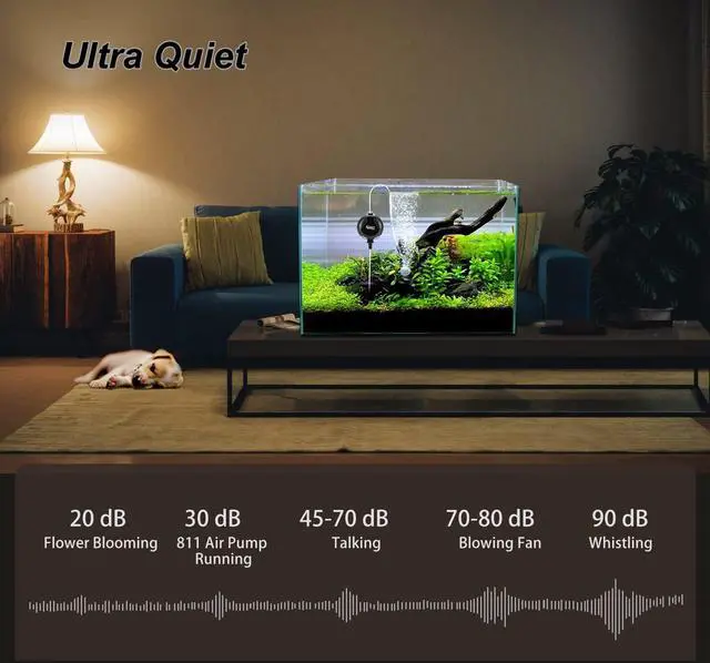 Super quiet fish air pump, you can hear nothing except the bubble bursting on the water surface. Great for used at bedroom, kitchen, living room and office desktop. Less than 35 dB. It does not push a lot of air, so your fish do not get scared of it.