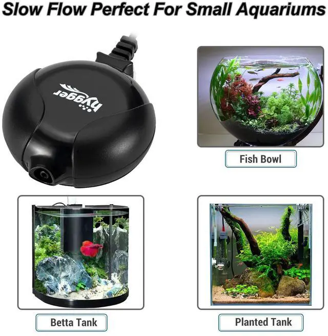 It can power a small air stone to aerate small fish tanks up to 15 gal. Slow flow is great for used in fish bowl, betta tank, shrimp tank, guppy tank, nano tank and goldfish tank.