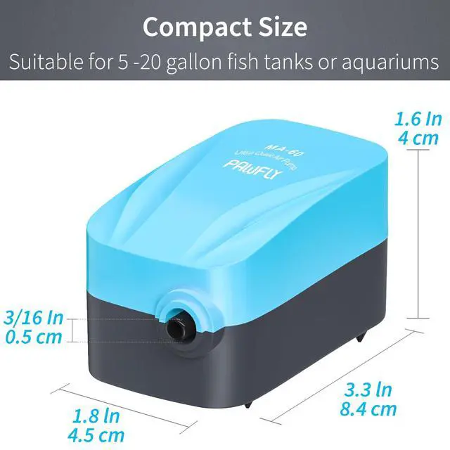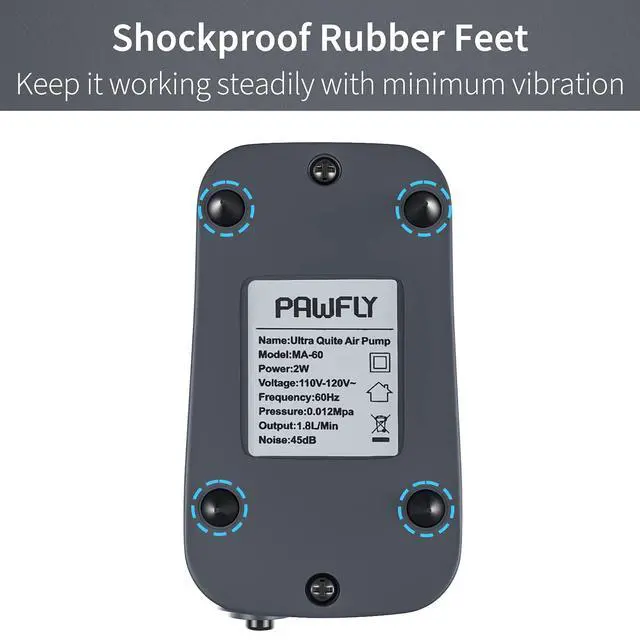 Pawfly MA-60 air pump is dependable to produce a good volume of air with extremely low power consumption. It features steady air flow, quietness, compact size and light weight. Suitable for 5 - 20 gallon buckets or fish tanks.