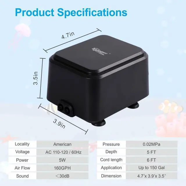 - 3.5W Suitable up to 120gallon fish tanks (cannot exceed 3.9 feet water depth), Pressure 0.019Mpa