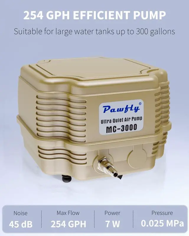 ![]() | 30-300 Gallons | 254 GPH | <40 dB | 1 | 7 W | 0.025 MPa | 5 x 5 x 3.3 inches | With 4 outlets divider | |