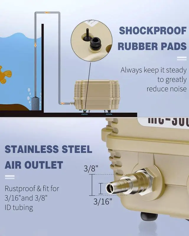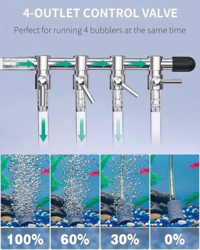 | Features | With 4 outlets divider | With adjustable rotary knob | With 4 air stones ball | With air stone and check valve | With complete accessories kit | Less noise from motor |