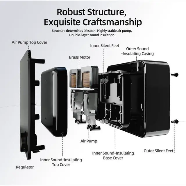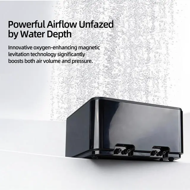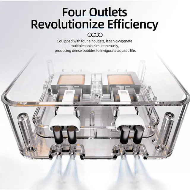 Robust 10W Performance for Large Setups Delivers a total airflow of 8L/min (2.0L/min per outlet) at 0.020MPa pressure, effectively supporting aquariums up to 200 gallons. Built with a high-efficiency copper-wound motor for stable, long-lasting operation in both freshwater and saltwater environments.