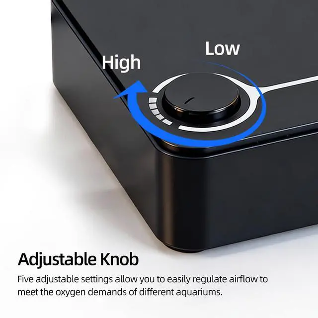 5-Level Precise Airflow Control Easily adjust oxygen output with the top-mounted knob across five distinct settings, tailored for delicate bettas, active community fish, shrimp tanks, or heavily stocked aquariums. Achieve the perfect balance of aeration without over-agitating your water.