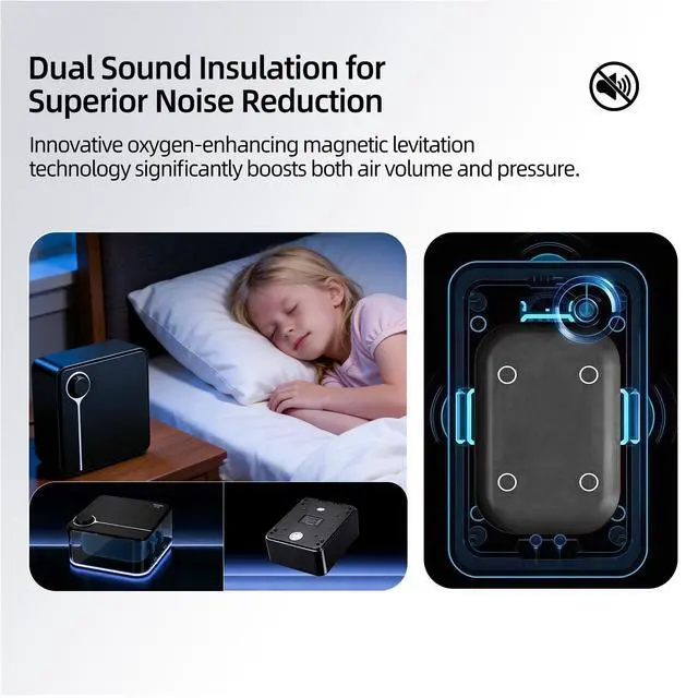 Triple-Layer Noise Reduction System Engineered for silence: features a magnetic levitation motor, 3 internal anti-vibration pads, 4 suspended silicone support columns, plus a dual-layer ABS sound-dampening housing and thickened anti-slip feet. Operates at 35dBquiet enough for bedrooms and offices.