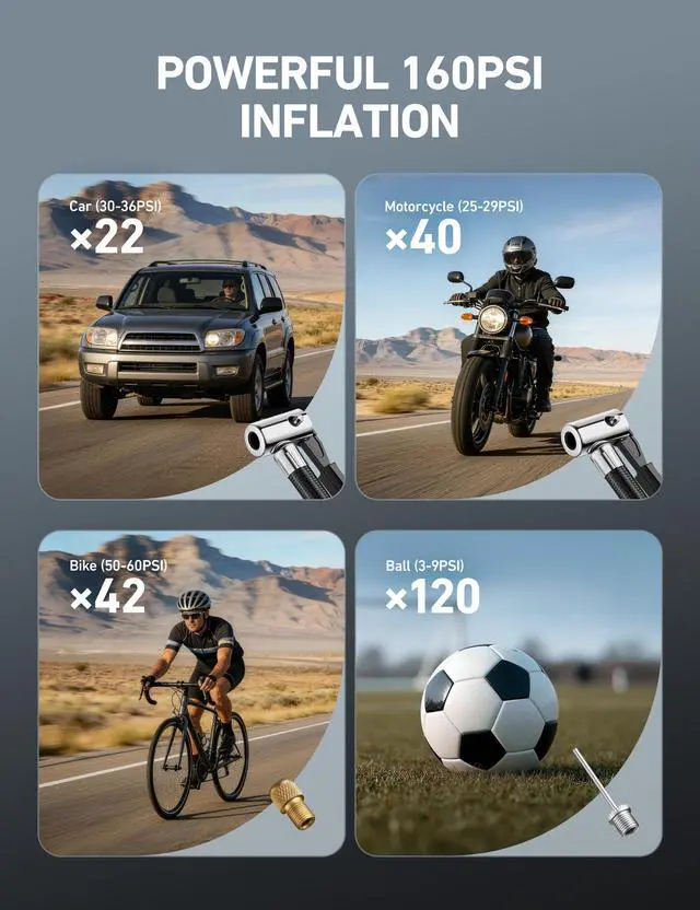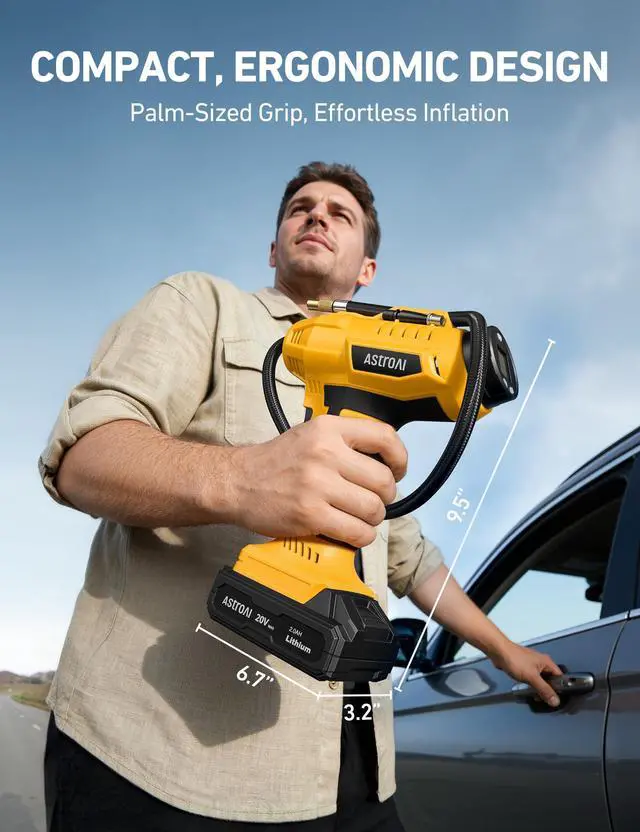 AstroAI Cordless Tire Inflator with Lithium Battery and Car Power Adapter You can preset tire pressure to what the tires need and it will automatically shut off when the pressure is reached. You do not have to worry about over inflating. Perfect for use on tires, inflatable toys, sports balls and more. Let it be your good helper in travel or on the road !
