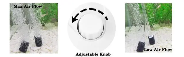 The small aquarium air pump has an adjustable knob, so can adjust the air pressure accordingly without scaring the fish who prefer soft water flow.
