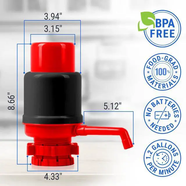 Enjoy fresh, great-tasting water with each gulp. This manual water pump is made of food-grade, odorless plastic. No need to worry about the pump affecting the taste or odor of your drinking water! A few drops of water may drip out of the spout after you stop pumping. We recommend waiting for a moment before lifting your filled cup.