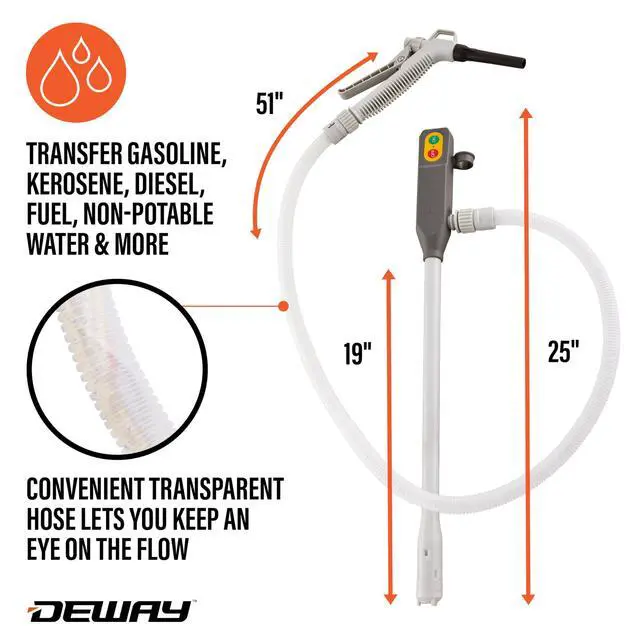 No more fumbling with heavy gas cans! Let the pump do the heavy lifting with the DeWay Battery-Powered Stick Transfer Pump collection. Featuring four newly redesigned pumps for transferring gasoline, kerosene, diesel fuel, non-corrosive liquids, non-potable water, dirty aquarium water, and more, this powerfully portable lineup offers options for convenient one-hand and completely hands-free operation. So, whether youre looking for a simple manual siphon for fueling cars and lawn equipment or a set and forget pump with automatic overflow detection, theres a model built to meet your specific needs. Instead of using a bulky control panel or external machine to pump, our highly-efficient motor is housed inside a thin, narrow suction stickmeaning, the intake tube fits inside almost any gas can or similar receptacle! Each pump comes equipped with an extended 51 discharge hose (clear, black, or rubber depending on your model), easy-access battery box with protective cover, drip-free hose storage clip, and simple on/off power switch. The collection also features four unique nozzle options to accommodate a wide range of uses, but all boasting the same impressive 3.2 gallon-per-minute transfer rate for the fastest, most efficient siphoning action run on batteries. So, stop putting your back and body in dangerous positionsand stick to the portable pump experts! Add a DeWay Battery-Powered Stick Transfer Pump to your cart today!