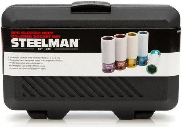 When you've invested in new wheels the last thing you want is to scratch or damage them the first time you remove them. Protect your investment by using the right tools for the job, the STEELMAN 95615 Socket Set is a 5-piece set of specialized metric and standard sockets that each have two polyethylene protective features as buffers between their durable chrome moly steel construction and your wheels. An outer sleeve protects your wheels while an insert protects the faces of the lug nuts. At 85mm long these 6-point sockets can reach lug nuts seated in the deep recesses found on some types of wheels. The anodized finish is also color coded for each size to allow for easy identification as well as providing increased rust and corrosion resistance. The blue socket is 17mm, gold is 19mm, red is 21mm, purple is 13/16-inch, and green is 3/4-inch. Durable construction is impact rated and works with any 1/2-inch drive impact wrench or breaker bar.